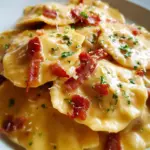 Ravioli Carbonara is a creamy pasta dish that combines cheese ravioli with a rich carbonara sauce made from eggs, cheese, and bacon.
